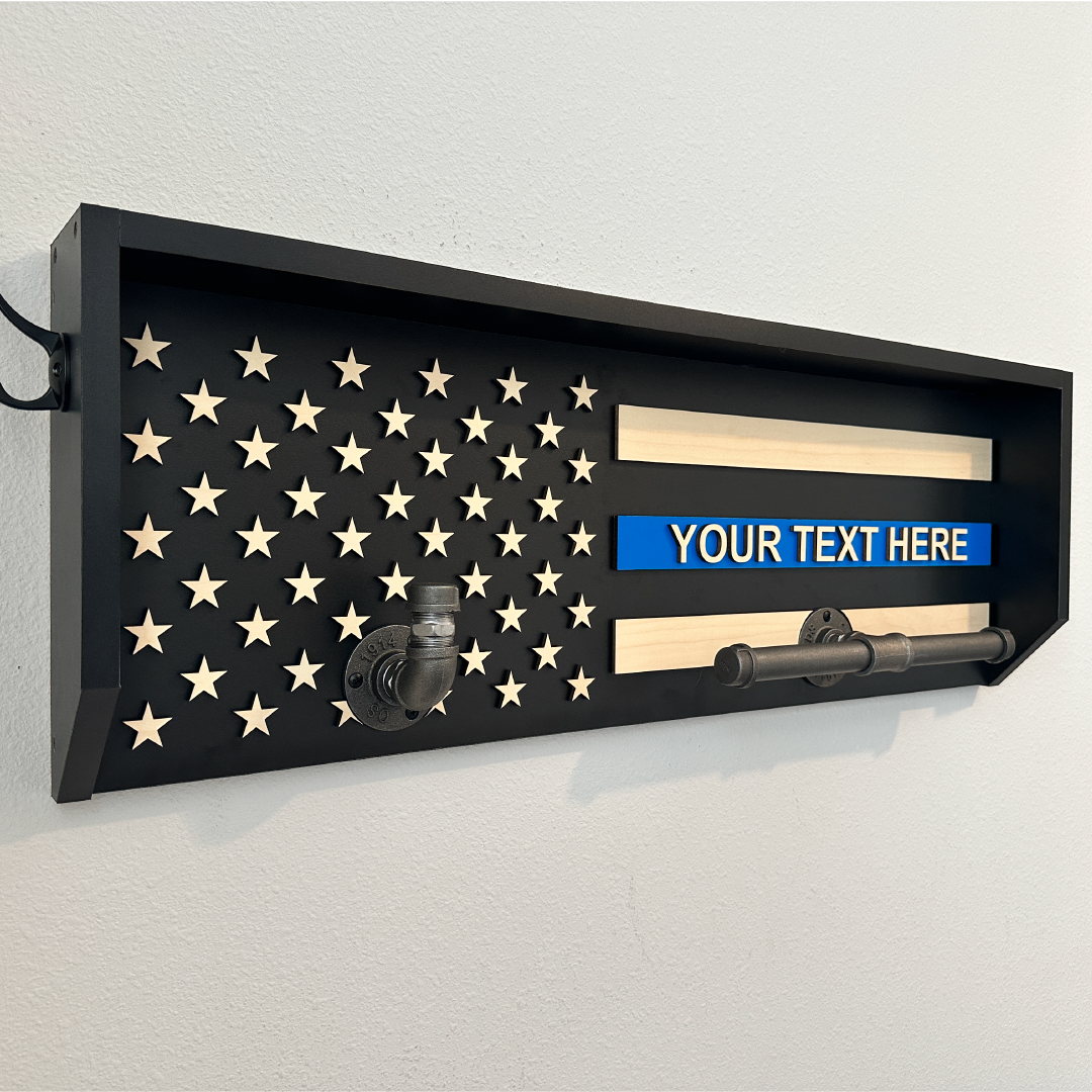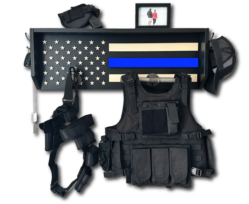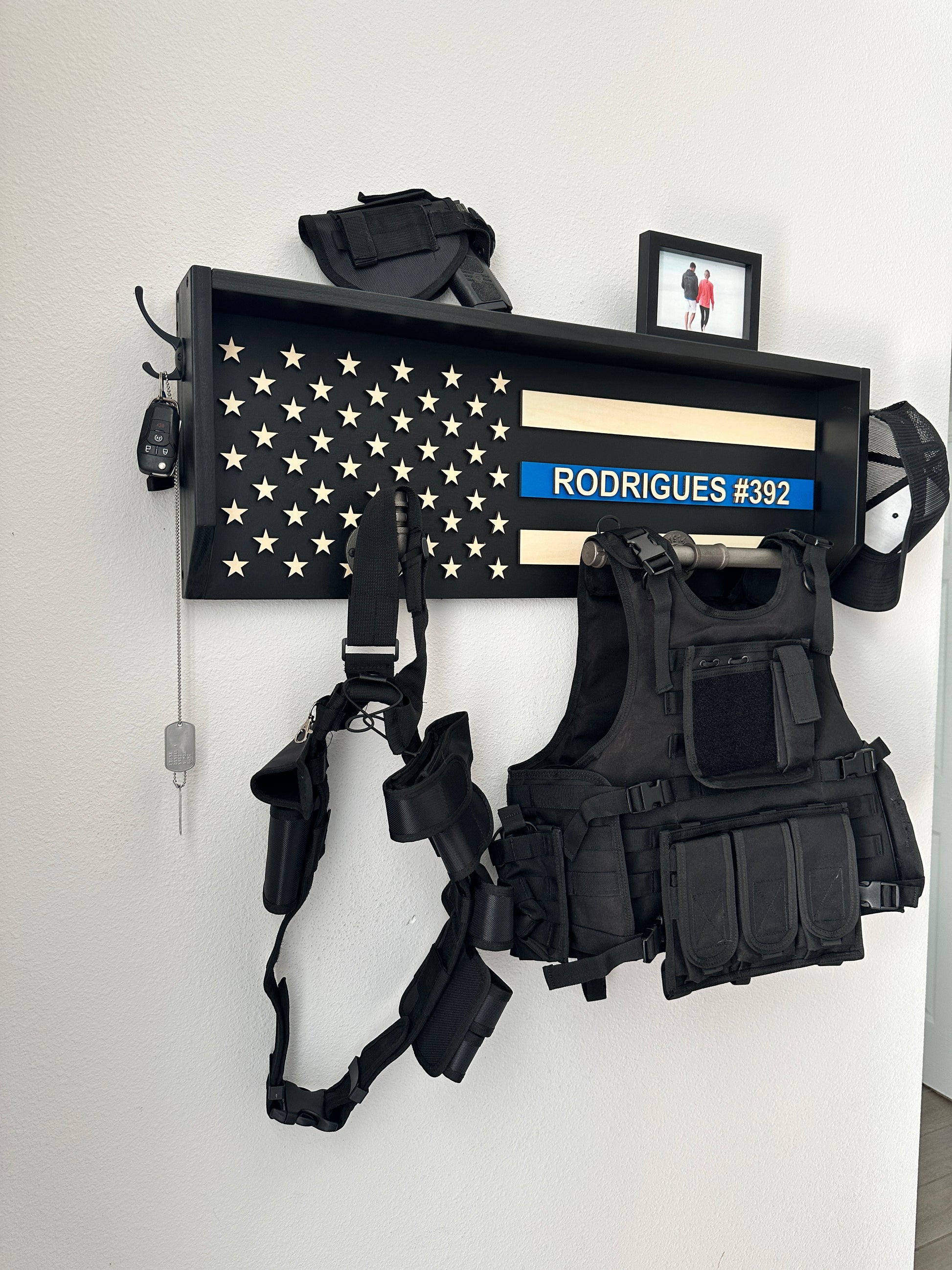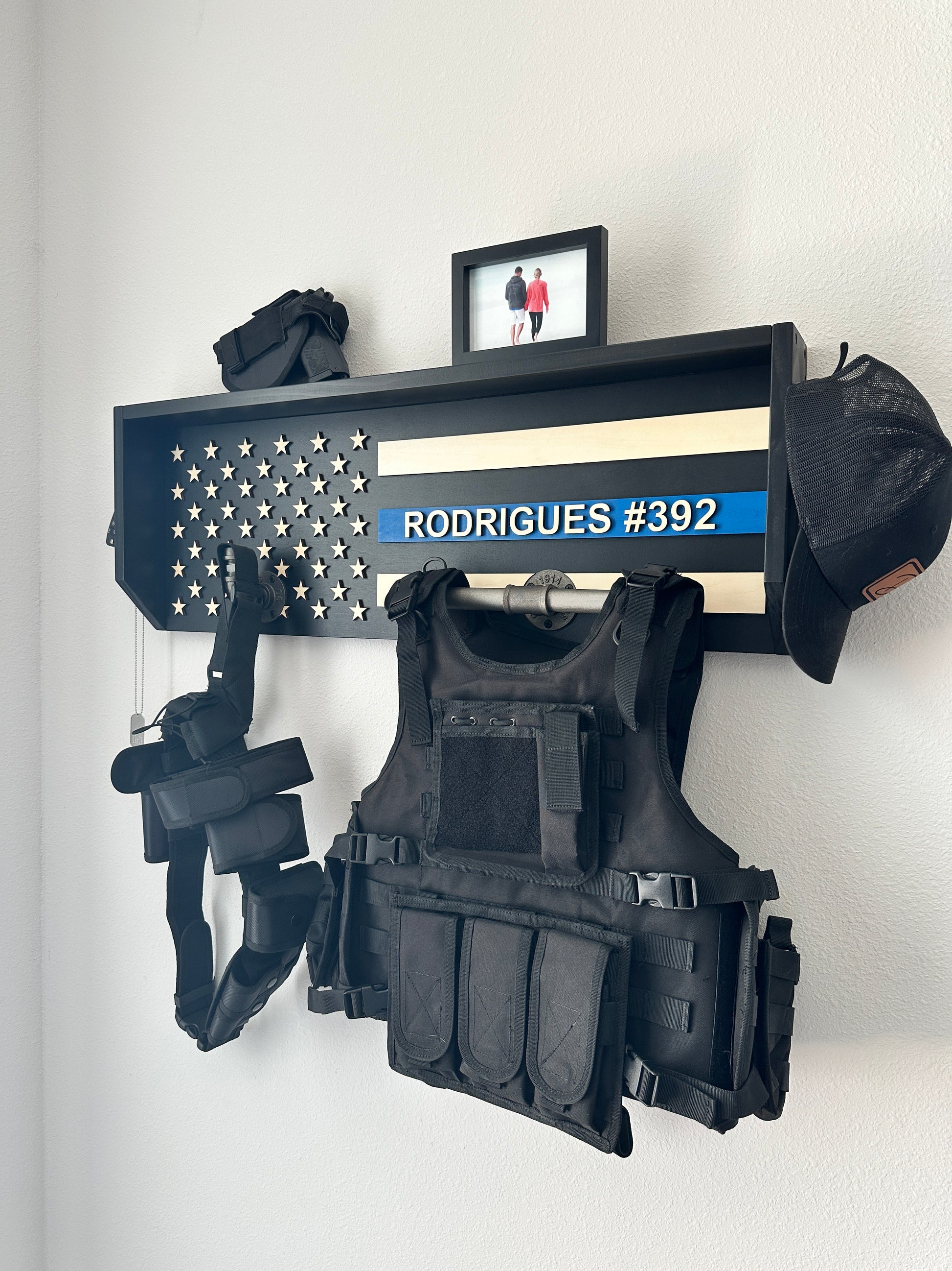 Law enforcement officers have a lot of gear to carry with them on a daily basis. This Police Gear Rack is the perfect way to organize and store all of that gear. A lovely Law Enforcement Gear Rack to keep your belongings organized and safe, this beautiful American Flag Gear Rack is the perfect addition to your home. A great gift for police officers, this Police Gear Rack is sure to please.